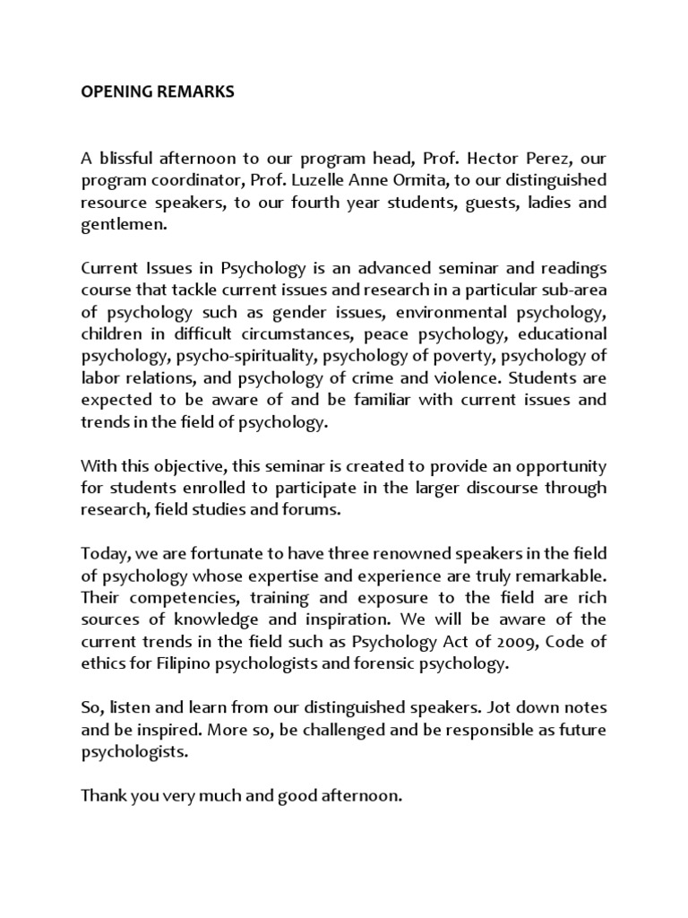 Opening Remarks Psychology Behavioural Sciences - End the speech by introducing the next speaker and thanking the audience.